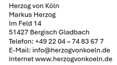 Anfragen zum Thema Datenschutz können per E-Mail an info@herzogvonkoeln.de oder postalisch an die
